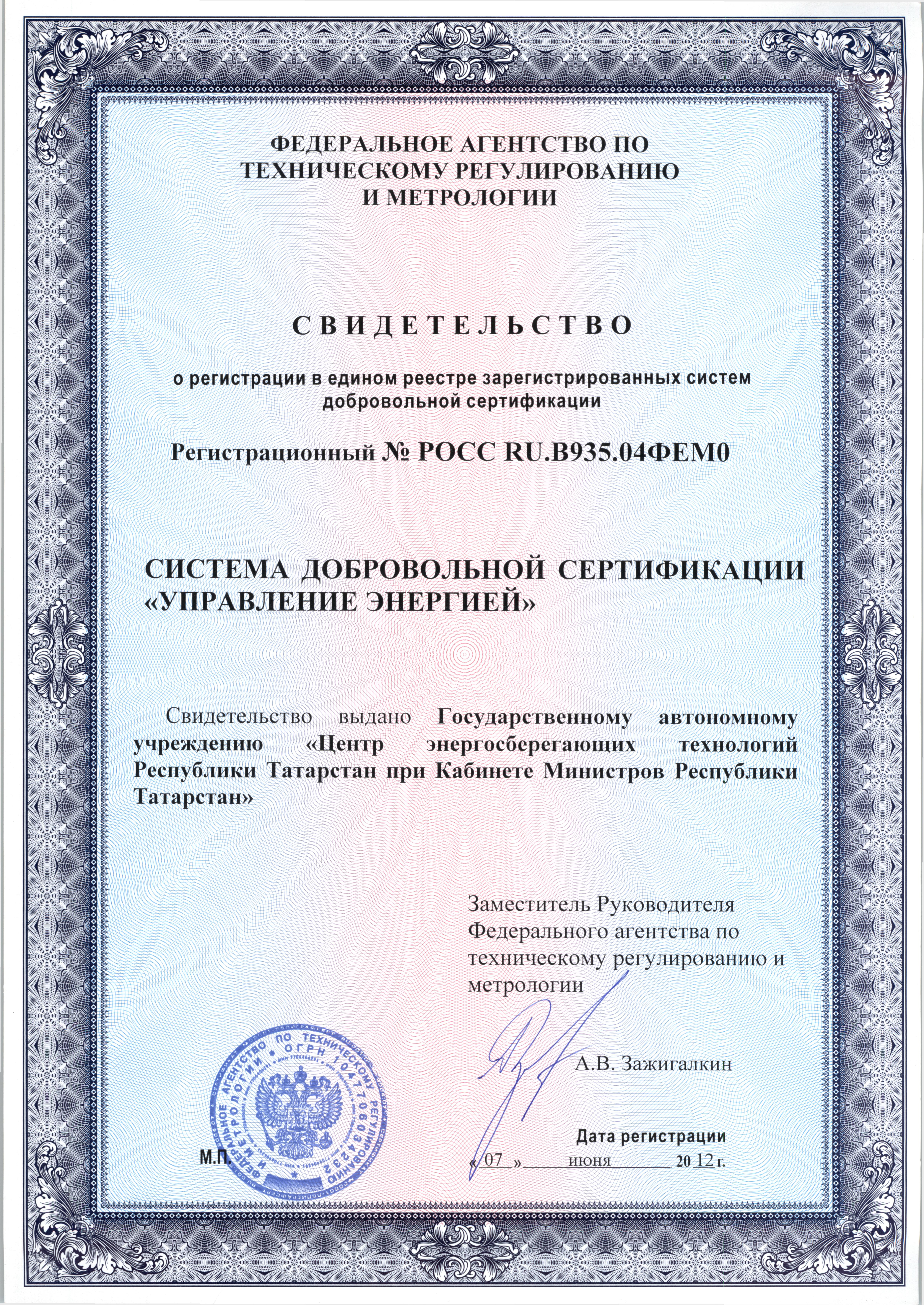 7 июня 2012г. Центром энергосберегающих технологий РТ получено Свидетельство о регистрации в едином реестре зарегистрированных систем добровольной сертификации