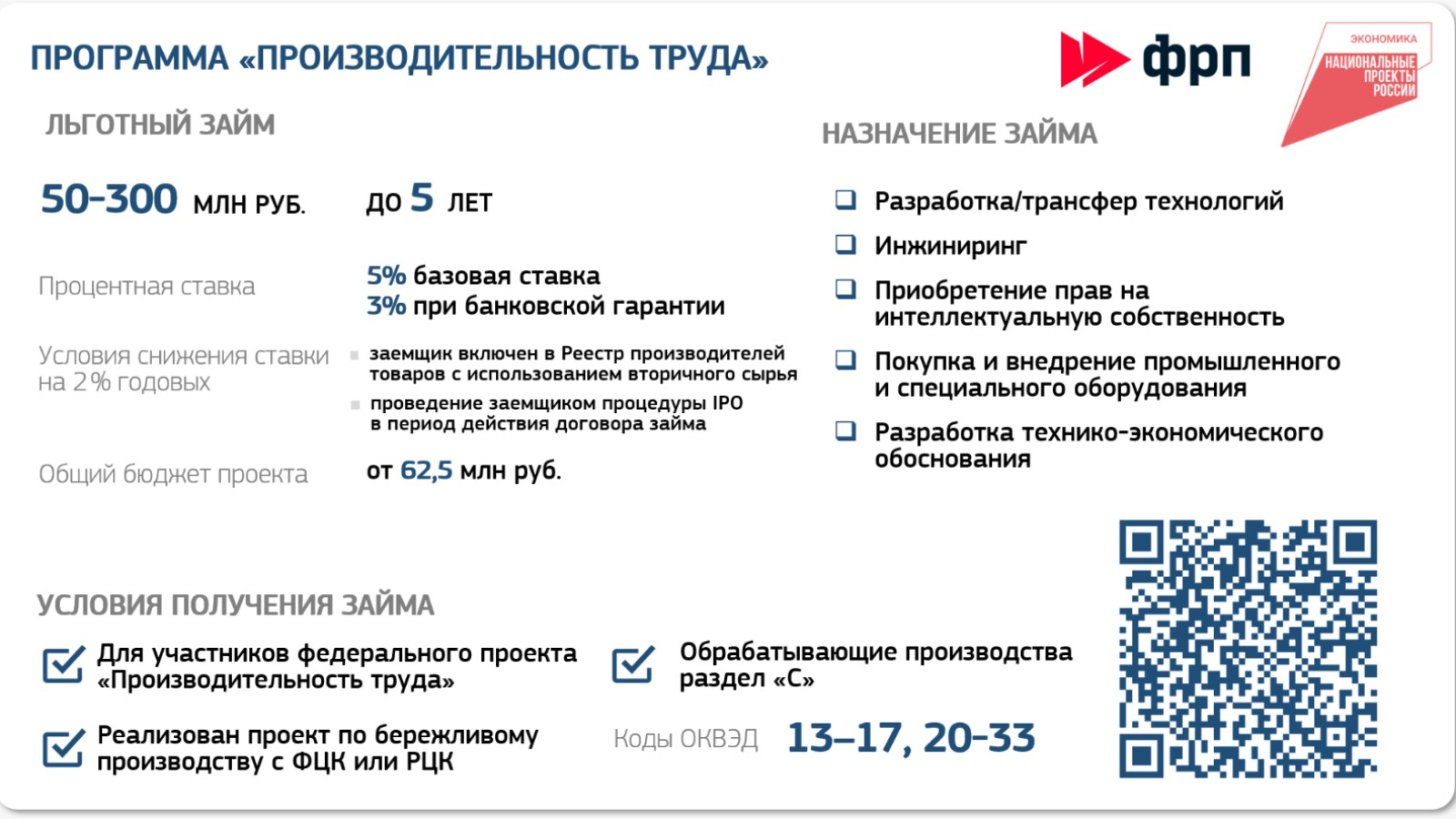 Для получения займа необходимо быть участником федерального проекта «Производительность труда» и реализовать с экспертной поддержкой федерального или регионального центров компетенций проект по повышению производительности труда по направлению «Бережливое производство».