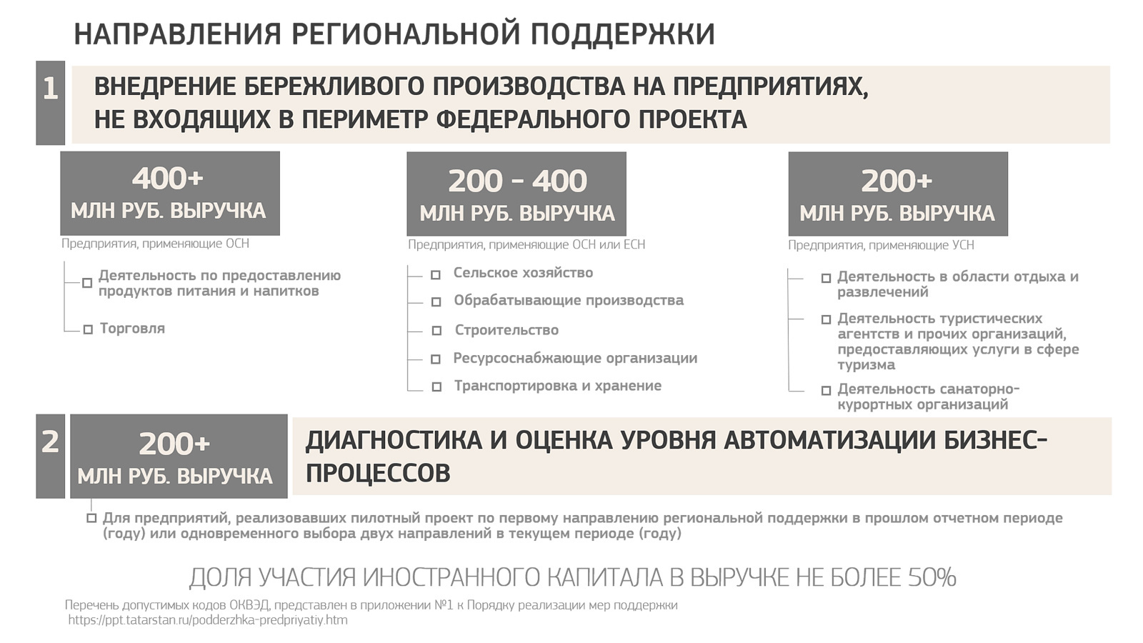 Отметим, что региональный проект является мерой поддержки Республики Татарстан и предоставляется предприятиям, которые хотят повысить свою эффективность, но не проходят по критериям участия в федеральном проекте «Производительность труда» национального проекта «Эффективная и конкурентная экономика».