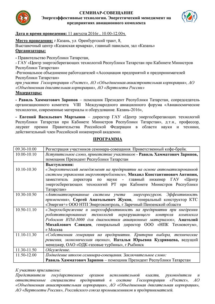 11 августа 2016г. в рамках деловой программы АКТО-2016 запланировано проведение семинара-совещания «Энергоэффективные технологии. Энергетический менеджмент на предприятиях авиационного комплекса». Организаторами семинара-совещания выступают Правительство Республики Татарстан, ГАУ «Центр энергосберегающих технологий Республики Татарстан при Кабинете Министров Республики Татарстан» и Региональное объединение работодателей «Ассоциация предприятий и предпринимателей Республики Татарстан».