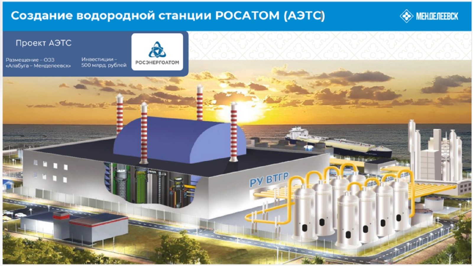 Татарстанның Менделеевск районында водород җитештерү буенча атом энерготехнология станциясен (АЭТС) төзү планлаштырыла. Яңа предприятие «Алабуга-Менделеевск» махсус икътисадый зонасының төп резидентларының берсе булачак. Бу хакта Татарстан Республикасының Инвестицион үсеш агентлыгында (АИР) район башлыгы һәм Менделеевск мэры Радмир Беляев хәбәр итте.